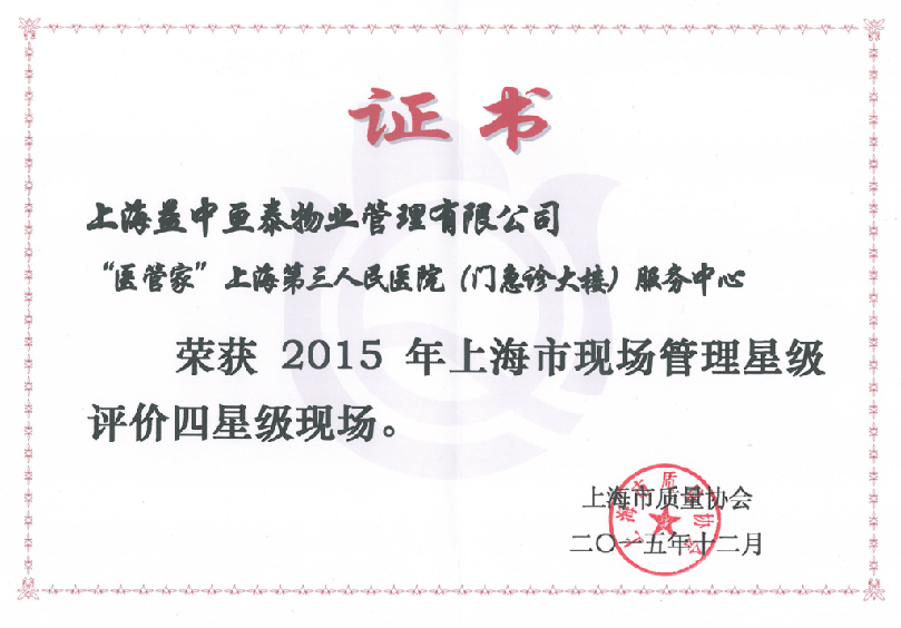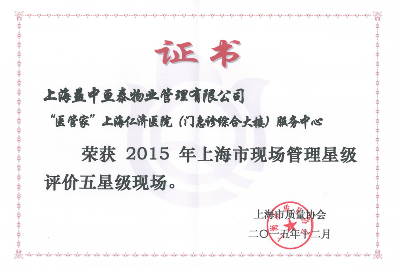 現(xiàn)場管理是企業(yè)管理的核心組成部分,是企業(yè)發(fā)展的堅(jiān)實(shí)基礎(chǔ)。2015年12月,上海益中亙泰物業(yè)管理有限公司(醫(yī)管家)上海仁濟(jì)醫(yī)院以及上海第三人民醫(yī)院(門急診綜合大樓)服務(wù)中心分別榮獲2015年上海市現(xiàn)場管理星級評價(jià)五星級現(xiàn)場和四星級現(xiàn)場。
