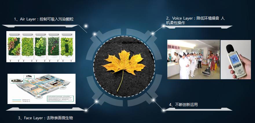 采用綠色天然物質(zhì),結(jié)合物聯(lián)網(wǎng)技術(shù)動(dòng)態(tài)監(jiān)測、人機(jī)管控,降低可吸入顆粒濃度,降低病房內(nèi)噪音,降低環(huán)境表面微生物含量,讓患者在綠色、潔凈、健康的環(huán)境中康復(fù)。