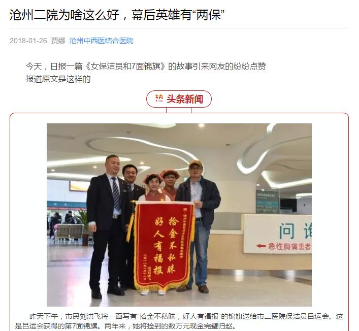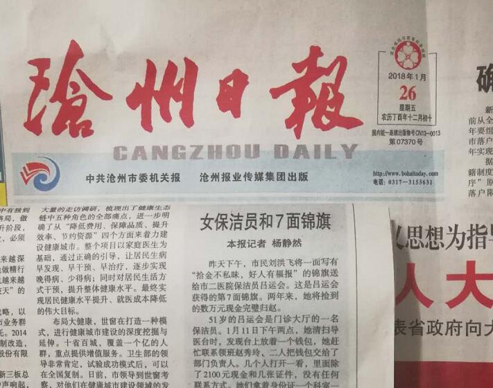 多年來(lái),呂運(yùn)會(huì)在門診大廳“撿漏”的總金額經(jīng)過(guò)統(tǒng)計(jì)已超過(guò)數(shù)萬(wàn)元,而她與7面錦旗的故事經(jīng)過(guò)河北省滄州中西醫(yī)結(jié)合醫(yī)院、《滄州日?qǐng)?bào)》報(bào)道和發(fā)酵后在網(wǎng)上引起了一段熱傳,她的熱心敬業(yè)、樸實(shí)善良深深的感動(dòng)著生活在各個(gè)階層的人,正如有些網(wǎng)友的評(píng)論一般“如果 換成一個(gè)不這么細(xì)致認(rèn)真的工作的人去那,估計(jì)一分錢也撿不到”。