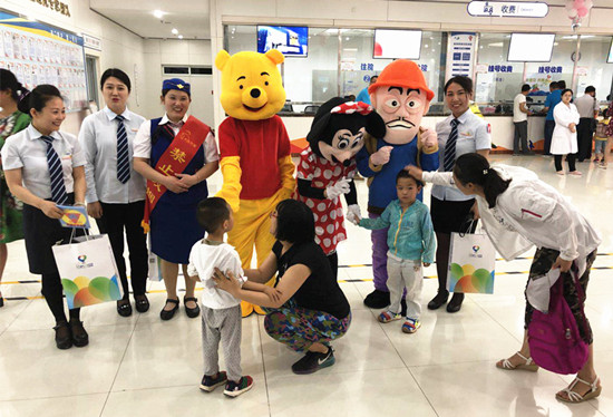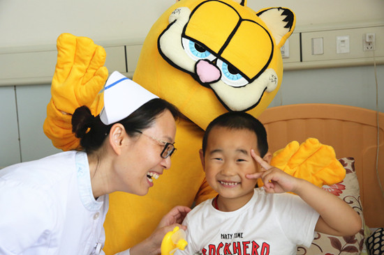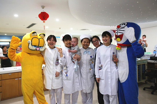 看這些送禮的隊伍,陣仗是不是挺大的?清掃車今天成了送禮車?!熬S尼熊”、“哆啦A夢”、“米老鼠”、“光頭強”等好多動畫片中的卡通玩偶一起出動,派發(fā)禮物,這讓孩子們歡呼雀躍?!皝泶騻€招呼、握握手、抱抱、親親…”孩子樂了,家長也笑了,醫(yī)生和護士也加入進來,和患兒一起互動,原本嚴肅的醫(yī)院今天充滿了喜悅的笑聲。