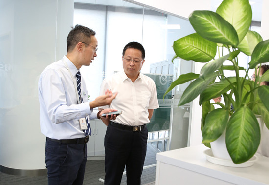 在“醫(yī)管家”總裁朱春堂,執(zhí)行副總裁宋天駿等人的陪同下,沈偉民副局長一行先后參觀了公司的文化建設(shè)長廊、研發(fā)中心、信息中心,對(duì)VR交互體驗(yàn)設(shè)備、自主創(chuàng)新產(chǎn)品、“廁所革命”成果、醫(yī)院后勤智能管理系統(tǒng)給予了高度評(píng)價(jià)。
