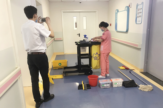 本次比賽歷時兩天,開設(shè)管理人員理論考試、保潔車擺放、病房保潔六步工作法、平車運送、輪椅運送、秩序維護隊列展示、消防演練、會務(wù)禮儀操、會務(wù)服務(wù)、有壓水管連接、工程星三角啟動等考核模塊。每一位參賽選手的操作經(jīng)過現(xiàn)場工作人員的實時視頻拍攝傳輸?shù)娇偛康碾娮悠聊?,由評委按照比賽細則進行認真打分。當(dāng)每一個操作,每一個動作在鏡頭中被無限放大,我們才會知道醫(yī)院后勤服務(wù)沒那么簡單,標準化服務(wù)也不是一句口號。比如說五色毛巾的正確疊法,會務(wù)倒水時身體傾斜的角度,使用滅火器時距離火源的距離、為患者陪檢前核對每一項信息.... 功在平時,臺下十年功才造就了臺上精彩的一分鐘。