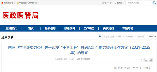 11月3日,國(guó)家衛(wèi)生健康委辦公廳發(fā)布 《關(guān)于印發(fā)“千縣工程”縣醫(yī)院綜合能力提升工作方案(2021-2025年)的通知》(以下簡(jiǎn)稱《通知》)。
