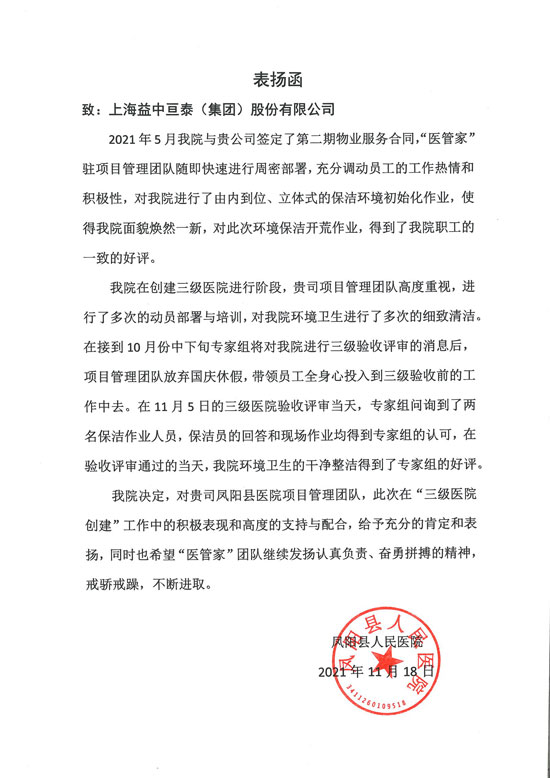 “醫(yī)管家”與鳳陽縣人民醫(yī)院攜手合作近6載,在此次院方“三級(jí)醫(yī)院創(chuàng)建”工作中,高度重視,積極配合,多次動(dòng)員進(jìn)行周密部署,加強(qiáng)員工專業(yè)能力培訓(xùn),對(duì)院方環(huán)境衛(wèi)生嚴(yán)格管控;國(guó)慶期間項(xiàng)目團(tuán)隊(duì)放棄休假,全身心投入到三級(jí)驗(yàn)收前的準(zhǔn)備工作中;在三級(jí)評(píng)審過程中,專家組隨機(jī)詢問現(xiàn)場(chǎng)保潔人員,對(duì)保潔人員的現(xiàn)場(chǎng)作業(yè)及專業(yè)性回答表示高度認(rèn)可,給予滿分好評(píng);院方也對(duì)“醫(yī)管家”長(zhǎng)期的優(yōu)質(zhì)服務(wù)及本次三級(jí)評(píng)審中的表現(xiàn)表示贊賞,并給予獎(jiǎng)勵(lì)。
