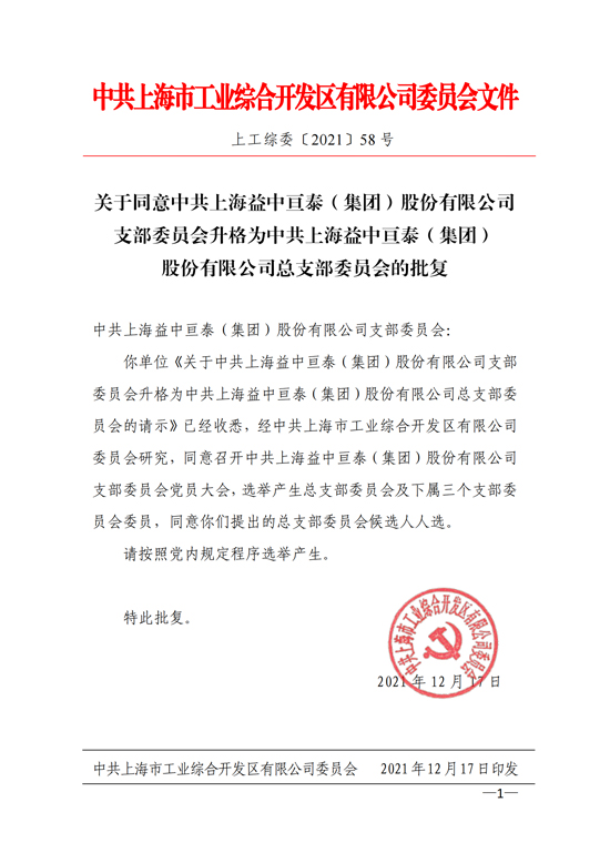 2021年12月17日,經(jīng)中共上海市工業(yè)綜合開發(fā)區(qū)有限公司委員會(huì)研究同意,批準(zhǔn)上海益中亙泰(集團(tuán))股份有限公司黨支部升格為黨總支部。