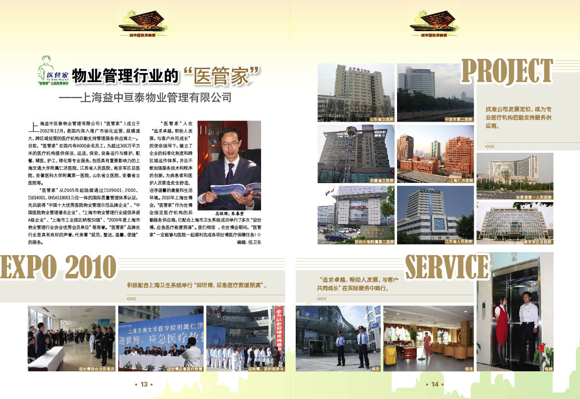 文中對我司從服務(wù)規(guī)模、管理體系、服務(wù)理念等多方法進(jìn)行了全面 的介紹和闡述。通過對服務(wù)項目的介紹、管理體系和所獲獎項的展示、公司文化和標(biāo)準(zhǔn)化制度的說明,使廣大讀者和客戶對“醫(yī)管家”有了全面深入的了解。文中最 后以“積極配合上海市衛(wèi)生系統(tǒng)舉行‘迎世博,應(yīng)急醫(yī)療救援預(yù)演’”、“找準(zhǔn)公司發(fā)展定位,成為專業(yè)醫(yī)療機(jī)構(gòu)后勤支持服務(wù)供應(yīng)商”、“‘追求卓越,幫助人發(fā) 展,與客戶共同成長’在實際服務(wù)中踐行”三個專題,用大量的圖片對我司進(jìn)行了展示。