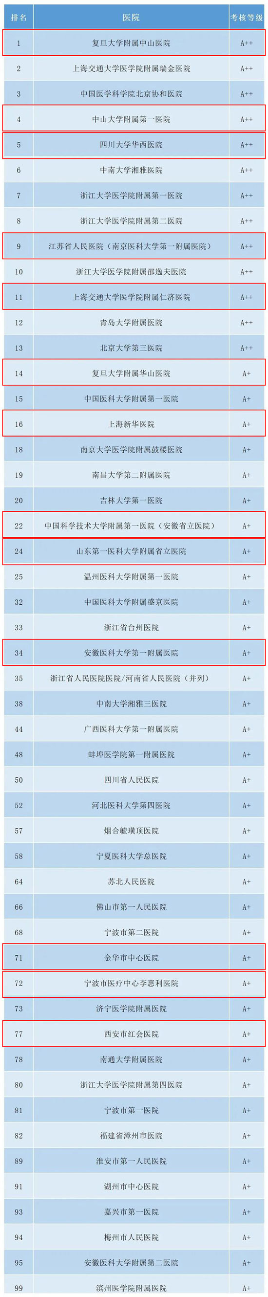 “醫(yī)管家”在此真誠(chéng)的祝賀合作的復(fù)旦大學(xué)附屬中山醫(yī)院在激烈的競(jìng)爭(zhēng)中一躍摘得桂冠,與中山大學(xué)附屬第一醫(yī)院、四川大學(xué)華西醫(yī)院、江蘇省人民醫(yī)院、上海交通大學(xué)醫(yī)學(xué)院附屬仁濟(jì)醫(yī)院躋身全國(guó)三級(jí)綜合性醫(yī)院前1%的A++最高評(píng)級(jí)隊(duì)伍。復(fù)旦大學(xué)附屬華山醫(yī)院、上海新華醫(yī)院、安徽省立醫(yī)院、山東第一醫(yī)科大學(xué)附屬省立醫(yī)院、安徽醫(yī)科大學(xué)第一附屬醫(yī)院等十幾家合作伙伴喜獲A+評(píng)級(jí)。