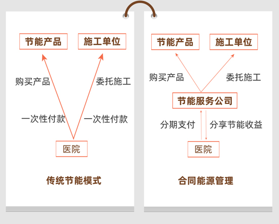 在合同能源托管模式下,醫(yī)院將節(jié)能工作統(tǒng)一授權(quán)給節(jié)能公司,由節(jié)能公司出資購買醫(yī)院所需的節(jié)能產(chǎn)品,進行改造施工,屬于節(jié)能范圍內(nèi)的設(shè)備由節(jié)能公司承擔(dān)維護維保工作,醫(yī)院因節(jié)能改造而節(jié)約的能源,經(jīng)第三方能源審計機構(gòu)測量,核定節(jié)能量,折算成能源費用,按比例分期支付給節(jié)能公司。
