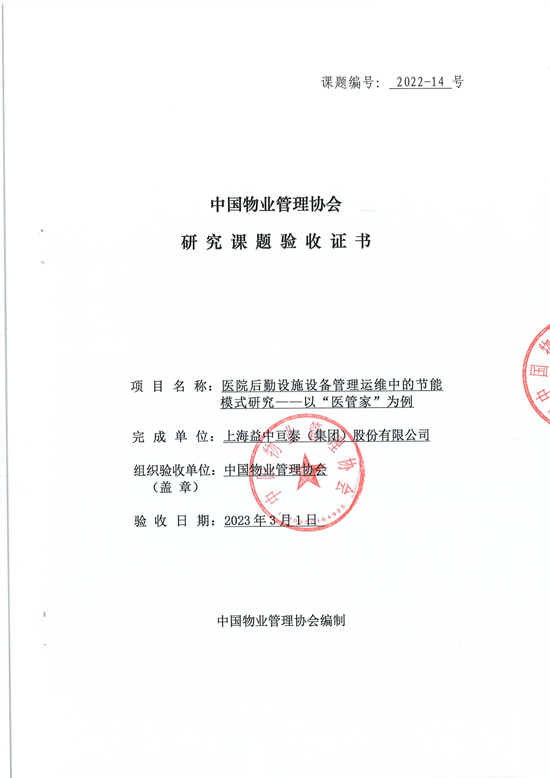 此次益中亙泰承擔(dān)的《醫(yī)院后勤設(shè)施設(shè)備管理運(yùn)維中的節(jié)能模式研究——以“醫(yī)管家”為例》研究課題,經(jīng)過專家評(píng)審組評(píng)審一致認(rèn)為,達(dá)到了國內(nèi)物業(yè)管理行業(yè)領(lǐng)域研究的先進(jìn)水平,在物業(yè)管理實(shí)踐中具有指導(dǎo)意義和推廣前景,予以通過驗(yàn)收。這是對(duì)益中亙泰一貫以來在醫(yī)院物業(yè)管理領(lǐng)域的不斷探索和努力的肯定,也是行業(yè)高度認(rèn)可的有力證明。
