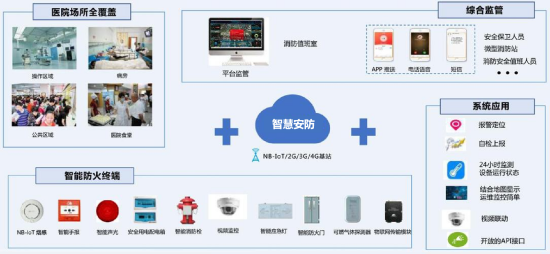其次,智慧安防以物聯網技術為核心,利用覆蓋范圍廣、連接力強、功耗低、成本低的 NB-IoT 技術,把煙感探測器、電氣火災探測器、剩余電流互感器、溫度傳感器、水壓探測器等多類型傳感探測器的無線傳感終端接入安消一體化管理平臺,實現對電氣設備、消防用水、煙霧明火和環(huán)境溫度等設備環(huán)境進行實時監(jiān)控,發(fā)現異常立即發(fā)出預警提醒醫(yī)院消防管理部門。