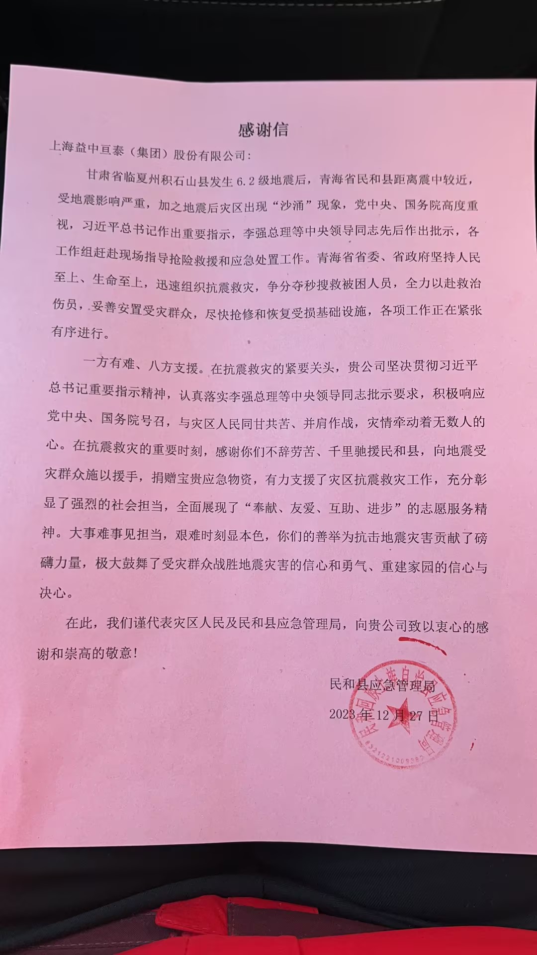 12月18日23時59分,甘肅省臨夏回族自治州積石山保安族東鄉(xiāng)族撒拉族自治縣發(fā)生6.2級地震,并波及鄰省青海。 震區(qū)群眾的安全牽動著全國人民的心,當(dāng)?shù)胤课?、道路、電力等基礎(chǔ)設(shè)施受損嚴(yán)重,公共機(jī)構(gòu)、居民面臨衛(wèi)生、防護(hù)用品需求激增的情況。 益中亙泰集團(tuán)迅速組織行動,發(fā)揚(yáng)“一方有難、八方支援”優(yōu)良傳統(tǒng),組織召開緊急工作會議,傳達(dá)中央及國務(wù)院國資委有關(guān)要求,成立集團(tuán)抗震救災(zāi)工作領(lǐng)導(dǎo)小組,并建立以集團(tuán)主要負(fù)責(zé)人為總指揮、區(qū)域公司總經(jīng)理為前線指揮的領(lǐng)導(dǎo)機(jī)制,對賑災(zāi)救援工作進(jìn)行統(tǒng)一部署,組織當(dāng)?shù)剡\(yùn)作及項(xiàng)目團(tuán)隊(duì)協(xié)同開展工作。