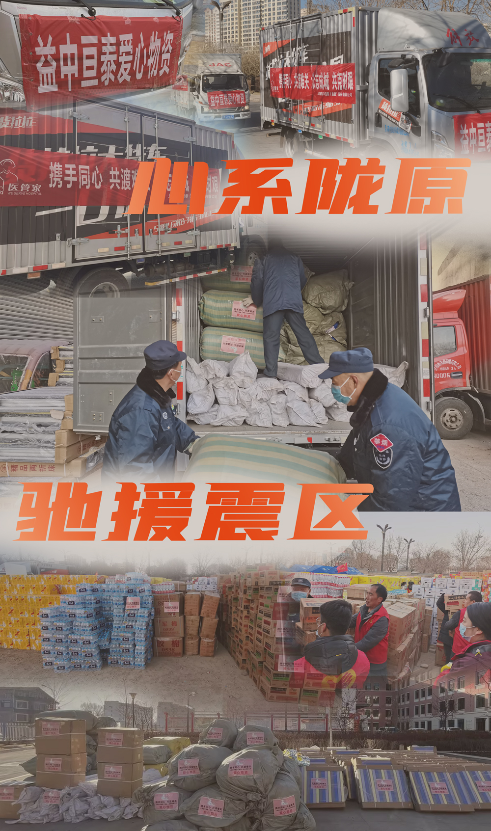 地震發(fā)生后,“醫(yī)管家”啟動應(yīng)急救災(zāi)快速響應(yīng)機(jī)制,12月23日,集團(tuán)總裁朱春堂、集團(tuán)執(zhí)行副總裁宋天駿總及總裁辦公室等積極組織安排棉被、棉衣及牛奶、方便面、礦泉水等用品,第一時間送往青海省海東市民和縣災(zāi)區(qū),用溫暖譜寫人間大愛,以馳援當(dāng)?shù)氐母黜?xiàng)緊急救援工作。