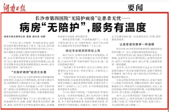 隨著我國老齡化的加深、社會結(jié)構(gòu)的變化,“陪護難”作為社會問題越來越突出,“無陪護”的重要性也變得越來越明顯。“醫(yī)管家”以呵護有加的服務(wù)實現(xiàn)貼心醫(yī)護、關(guān)懷患者的理念,助力“無陪護”病房服務(wù)。近日,“醫(yī)管家”長沙市第四醫(yī)院服務(wù)中心受到湖南日報的專題報道,自合作以來,服務(wù)中心結(jié)合醫(yī)院的實際情況,提供科學有效的服務(wù)模式,減輕患者壓力,提升患者體驗,保障醫(yī)院高效運轉(zhuǎn)。