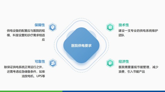 醫(yī)院供電應遵循保障性、技術性、可靠性和經(jīng)濟性4大原則,供電設備的配置應與醫(yī)院的規(guī)模、科室設置和診療需求相適應,并建設一支專業(yè)的供電系統(tǒng)維護團隊。除保證供電系統(tǒng)正常運行之外,還需考慮應急儲備條件,如柴油發(fā)電機、UPS等。同時,醫(yī)院需要重視節(jié)能管理,并引入節(jié)能產(chǎn)品。