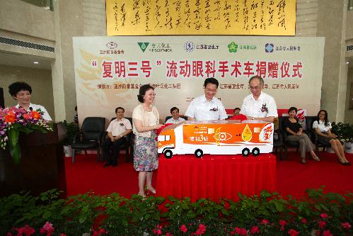 2010年8月23日 上午,新“復(fù)明三號(hào)”流動(dòng)眼科手術(shù)車捐贈(zèng)儀式在江蘇省人民醫(yī)院隆重舉行。在捐贈(zèng)儀式上,江蘇省人民醫(yī)院院長(zhǎng)王虹代表數(shù)以萬(wàn)計(jì)的白內(nèi)障患者感謝亞洲防盲基金 會(huì)等多年來(lái)為江蘇復(fù)明扶貧事業(yè)做出了巨大貢獻(xiàn),同時(shí)還特別感謝各級(jí)政府,高度重視和大力支持使復(fù)明扶貧工作得以順利開(kāi)展。