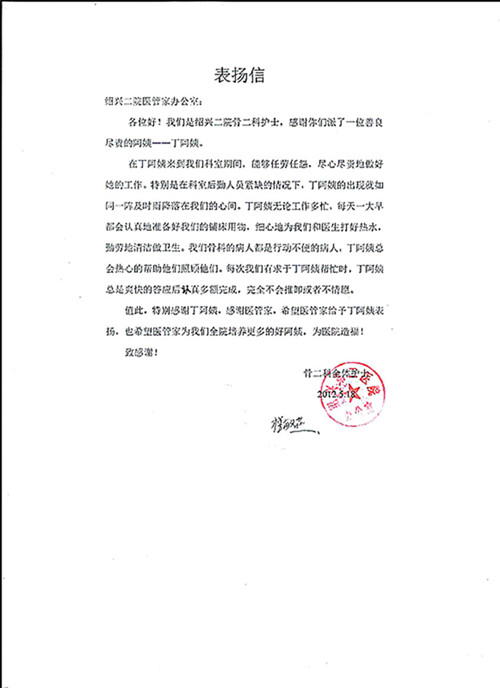 近期,我公司總部收到紹興二院骨科和血液科的兩封表揚信,兩科護士對我們公司的兩位保潔員任勞任怨,勤勤懇懇的工作態(tài)度進行了大力表揚。附表揚信原文,供大家學習。