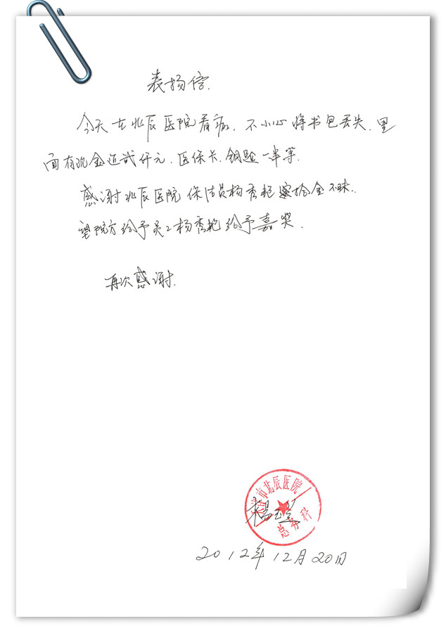 失主是一名64歲的女性退休老教師,經(jīng)過確認劉主管將書包歸還于老教師,老教師萬分感激,當(dāng)場寫下表揚信交予院方總務(wù)科李科長。李科長對于我們的環(huán)境管理部員工楊秀艷的拾金不昧表示高度贊揚,夸獎我們“醫(yī)管家”人有像金子一樣閃閃發(fā)光的心靈!