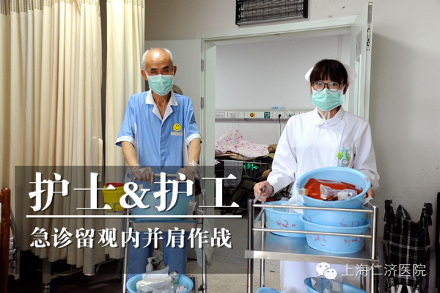 急診留觀病房內,護士姑娘和“醫(yī)管家”護工老師傅推著滿載藥物的治療車,準備開始一天的治療工作。