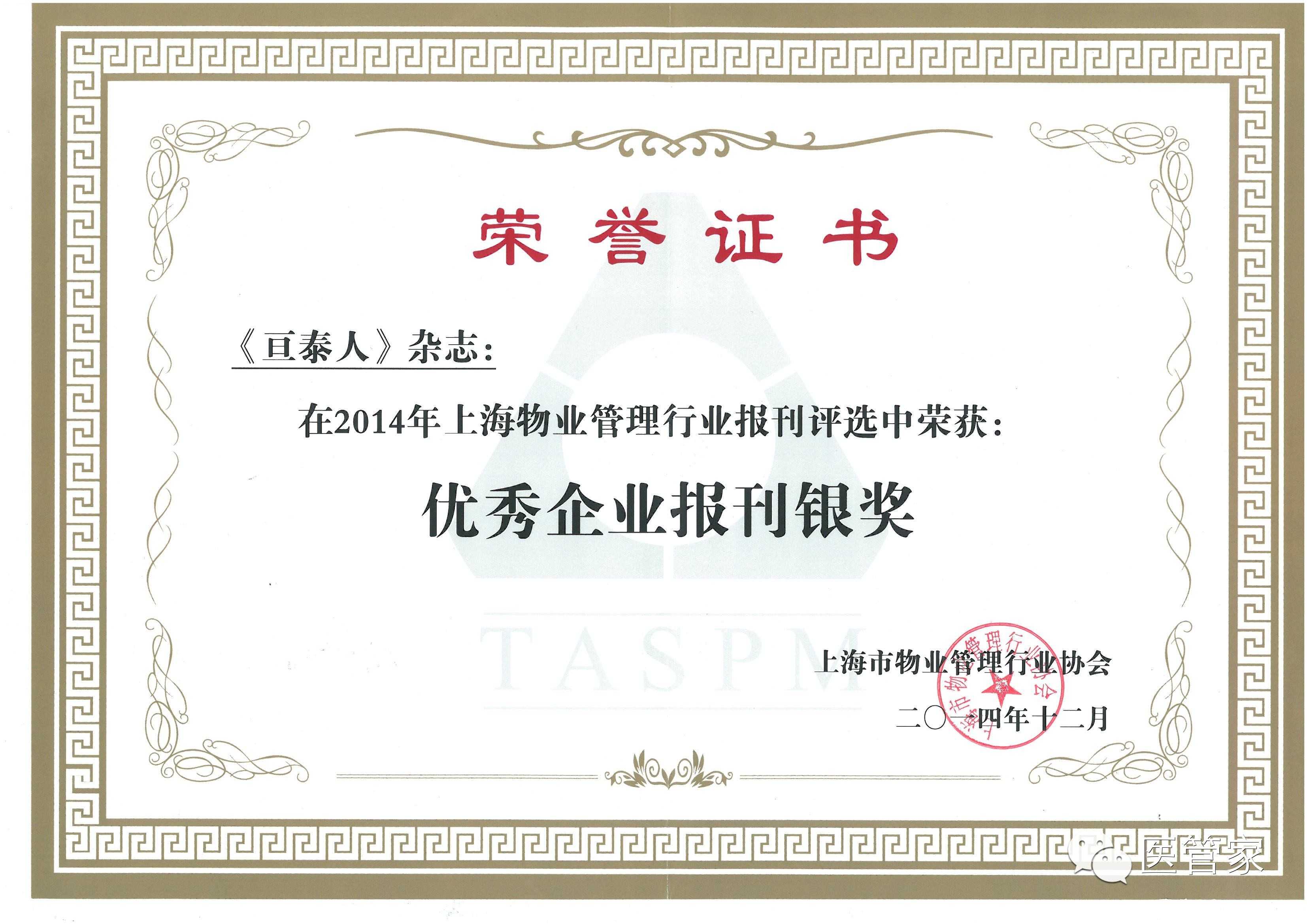 為展現(xiàn)我司《亙泰人》雜志的特色與優(yōu)越性,我司“醫(yī)管家”參加了由上海物業(yè)管理行業(yè)協(xié)會組織的2014年度優(yōu)秀企業(yè)報刊評選活動,并獲得了2014年度“優(yōu)秀企業(yè)報刊銀獎”。