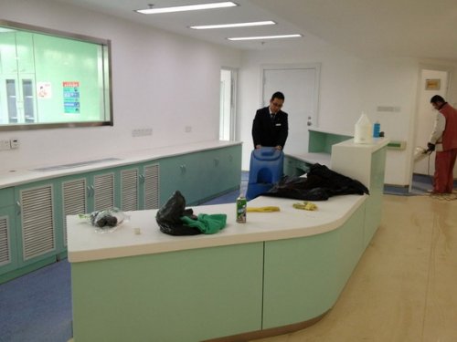 標(biāo)準(zhǔn)嚴(yán)格,迎難而上。為不影響病人的正常入住,醫(yī)院要求2015年元月1日前全面完成3-5樓全面清潔工作。保潔任務(wù)難度大,責(zé)任重。為期近4個(gè)月的工程施工,除墻面、地面等全面翻新外,剩余未改造部分如東西陽(yáng)臺(tái)、所有玻璃和窗槽等區(qū)域造成大量積灰,部分區(qū)域存在較多建筑垃圾,清潔難度進(jìn)一步加大;同時(shí),由于病人入住后病房?jī)?nèi)病床不可隨意移出,在一定程度上將增加PVC地面后續(xù)保養(yǎng)的難度。為不影響醫(yī)院按計(jì)劃進(jìn)行科室調(diào)整搬遷,院務(wù)處分管人員及時(shí)協(xié)調(diào)“醫(yī)管家”項(xiàng)目管理團(tuán)隊(duì)組織員工分班,分層、分時(shí)的晝夜清潔,同時(shí)做好3-5層人員的配備工作。