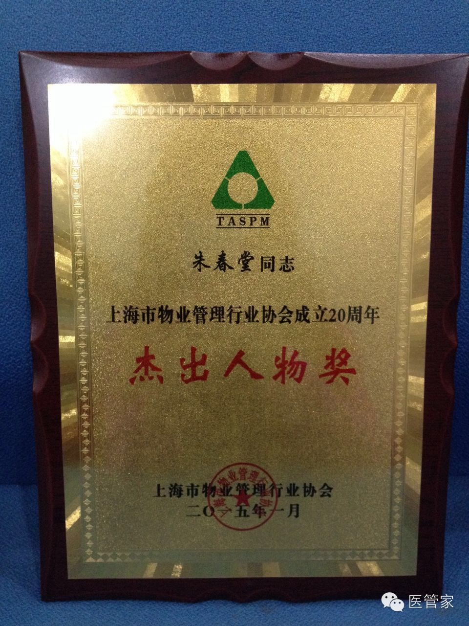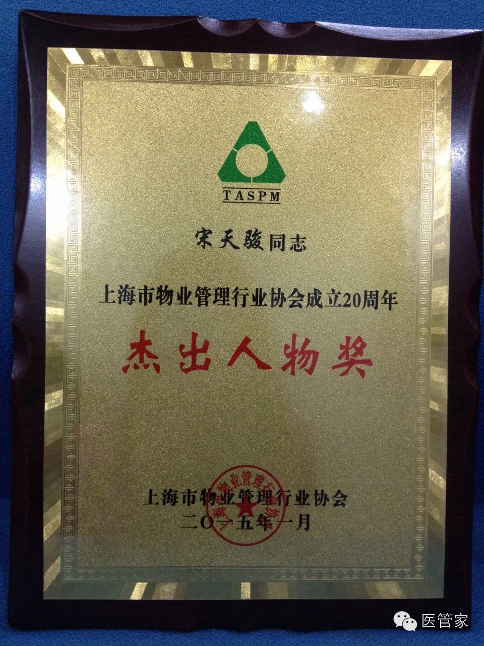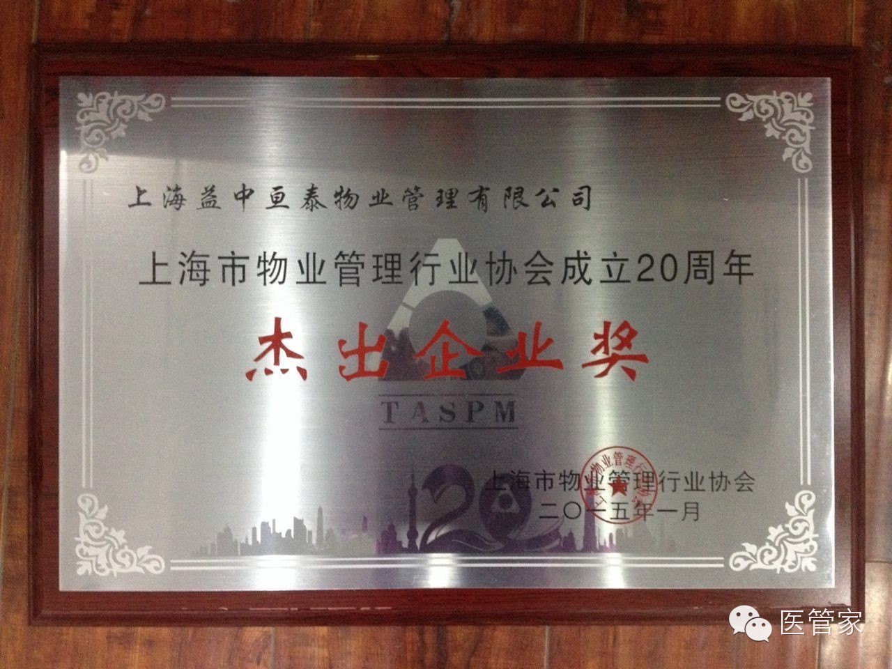 根據(jù)上海市物業(yè)管理行業(yè)協(xié)會決定,經(jīng)過各區(qū)工作委員會初評、行業(yè)協(xié)會推薦、專家評審的辦法,我司上海益中亙泰物業(yè)管理有限公司(“醫(yī)管家”)榮獲上海市物業(yè)管理行業(yè)協(xié)會成立20周年---杰出企業(yè)獎,同時,“醫(yī)管家”總裁朱春堂以及副總經(jīng)理宋天駿同時獲得上海市物業(yè)管理行業(yè)協(xié)會成立20周年---杰出人物獎。