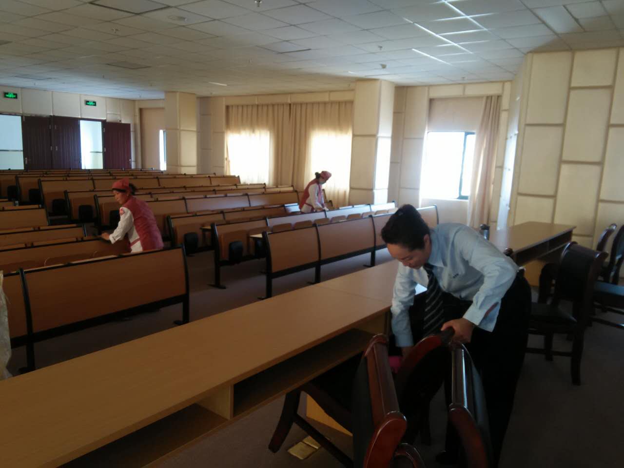 10月26日終于完成了8號樓的保潔工作,醫(yī)院領(lǐng)導們都很滿意;不想27日早上卻又發(fā)生了狀況,7樓安裝窗簾,打孔時塵土飛揚,3樓更換玻璃,玻璃碎片散落一地,現(xiàn)場“慘不忍睹”…….當天下午就要迎接專家的檢查,又是一個棘手的問題,緊急時刻,營運部門立即調(diào)集人員進行突擊清潔。這時新的困難又來了,保安人手不夠,原本從其他項目借調(diào)特勤人員站崗的,后來因有事無法安排人員支持,緊急情況下,沒有條件我們也要創(chuàng)造條件完成工作,咱們的丁偉平經(jīng)理親自換上保安服,代替特保值崗27日下午18點,我們終于完成了這次迎評環(huán)境衛(wèi)生的接待工作,并受到院方領(lǐng)導的好評。中醫(yī)藥大學過院長說代表醫(yī)院感謝我們,還特別表揚了丁經(jīng)理這次迎評活動,我們雖然辛苦但都很開心,因為我們把中醫(yī)藥大學8號樓臨床教學樓當成新的起點,大家都在為“新家”而戰(zhàn)。
